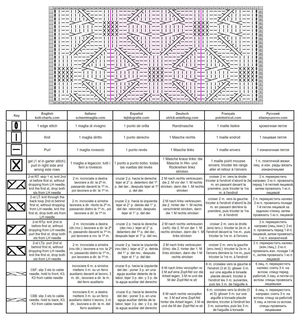 Rows 35 and 41: edge st, k1, p2, C6F, p2, gst2, * gst2, p2, C6B, p2, C6F, p2, gst2 *; repeat from * to *; gst2, p2, C6B, p2, k1, edge st.