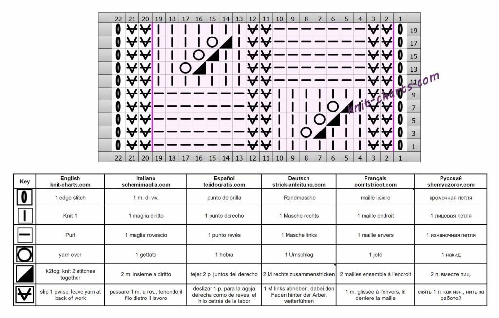 Cast on 22 sts (18 + 2 + 2 edge sts) and work according to сhart.