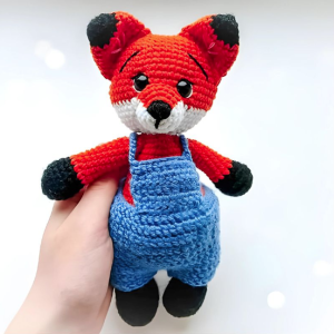 The size of the finished crochet fox when using the specified materials is about 20 cm with ears.