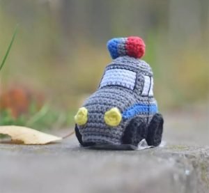 - Yarn Pekhorka Successful (100% mercerized cotton, 50 g / 220 m): gray (main), blue (side inserts and part of the flasher), white (windows), black (wheels), red (part of the flasher), yellow (headlights)